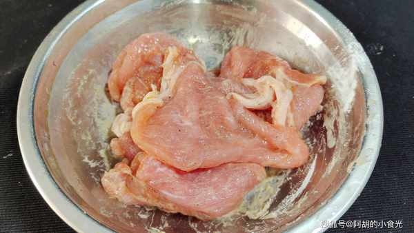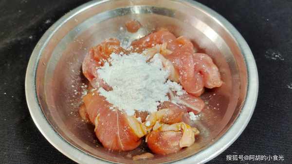 第二步:準備豬裡脊肉一塊,隻取比較規整得瘦肉部分,切片後放入碗中,加入食鹽和胡椒粉抓拌均勻,再淋入生抽和料酒抓拌均勻,最後再來一湯匙得幹淀粉抓拌均勻,給肉過上一層粉漿。