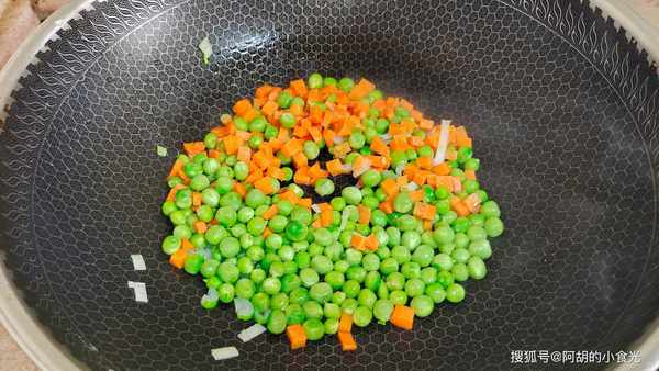 第三步:鍋裡燒油,下加入蔥花爆出香味,接著加入胡蘿卜和豌豆粒翻炒30秒鐘時間。