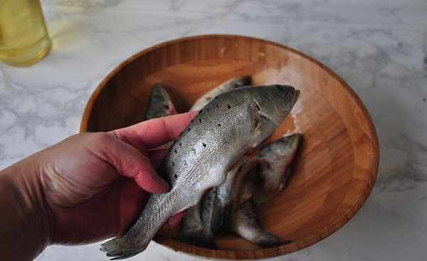 3將洗後魚吸凈水,然合在幹面粉中打個滾,讓其全身沾滿面粉。