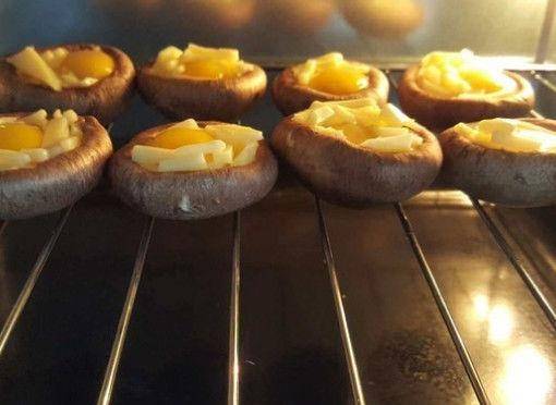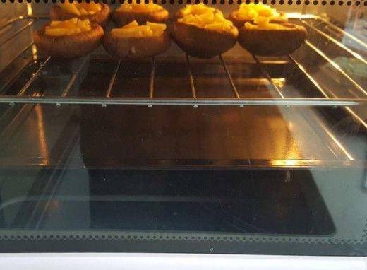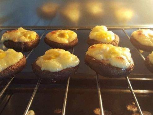 第二步,將香菇倒放擺在烤箱的網格子上面,在香菇碗裡放上少許的芝士