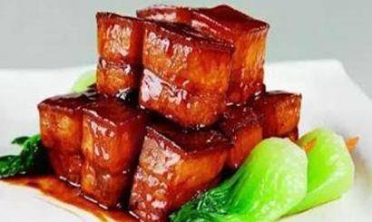 2、凈鍋燒熱,放入色拉油50克,放入蔥、薑煸香,倒入焯水後的五花肉,小火煸炒至出油,加老抽、白糖、黃酒、清水,大火燒開後轉小火加蓋,小火煨制約90分鐘,待其肉質酥而不爛,再加入味精5克,開旺火收汁,盛入器皿中,用清炒的菜心點綴。