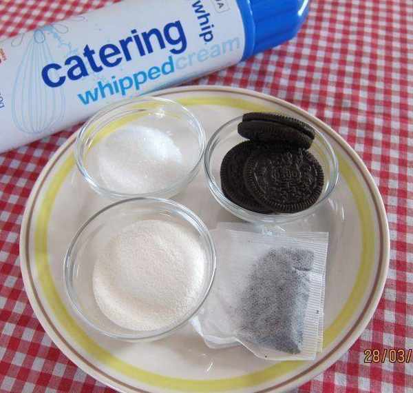 原料:紅茶袋、奶粉精、白糖、鮮奶油、餅幹、清水。