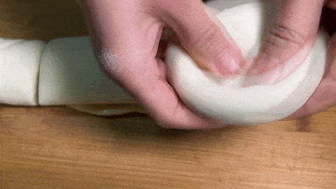 20. 然後取一段兩端捏緊,做成窩窩頭的形狀,將肉餡放在裡面