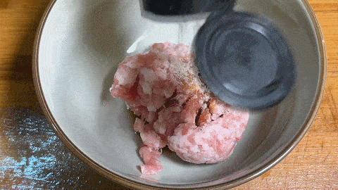 10. 在肉餡中,加入食鹽,味精,生抽,料酒