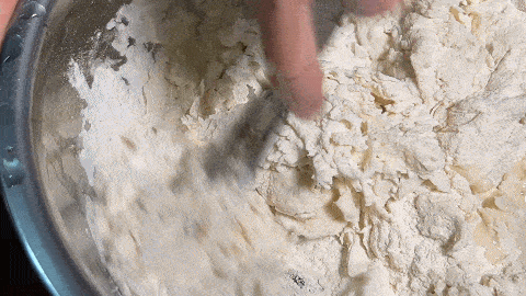 3. 攪拌成沒有幹面粉的面絮,加入植物油,