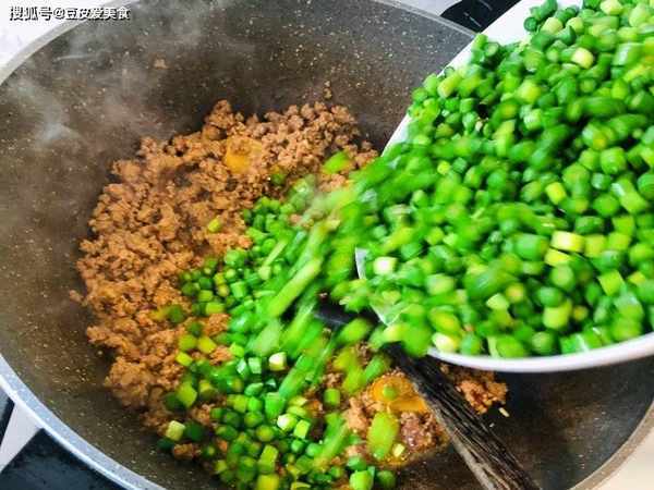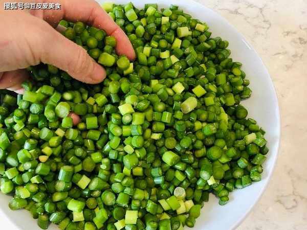 1、蒜苔清洗幹凈,瀝幹水分,切成小粒。撒上少許鹽,抓拌均勻。肉清洗幹凈,剁碎,加入1勺生抽,1勺老抽,1勺料酒,攪拌均勻。