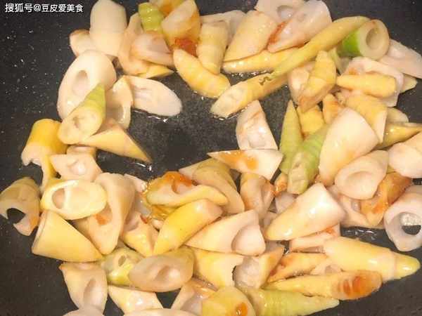 4、下入蠔油,生抽,翻炒片刻,再加點水,蓋上蓋,中火燜煮2-3分鐘,至筍熟透,再淋入少許陳醋,轉大火收汁,出鍋,完成。