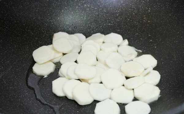 2、炒鍋上火燒熱,放少許食用油,先把山藥片放到鍋裡翻炒至熟,小火煎炒就可以瞭;