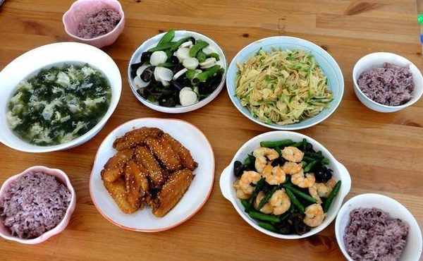 除瞭四道傢常菜以外,就是快手紫菜蛋花湯和二米飯瞭,都是簡單易做的,二米飯是指除瞭大米以外,還摻瞭任意一種米一起燜煮時尚的米飯,這次加的一小把黑米在大米裡,燜出來的飯顏色發紫,很是好看,吃起來也香,是我傢比較常吃的一種米飯。