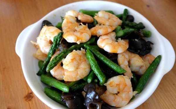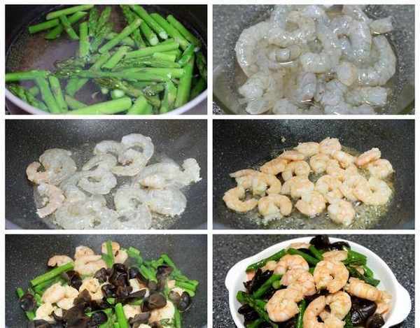 原料:蘆筍、蝦仁、黑木耳、食用油、鹽、蔥薑料酒;
