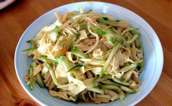 詳細做法:幹豆皮用溫熱水浸泡變軟,切成條狀,放到開水鍋裡燙一下立刻撈出放到大碗裡;杏鮑菇手撕成條,放到開水鍋裡焯熟,撈出後也放到大碗裡,再加上切成絲的黃瓜絲,倒入生抽醬油、鹽、香醋、香油、白糖拌均勻,喜歡吃辣的還可以放點辣椒油,這道菜就可以上桌瞭。