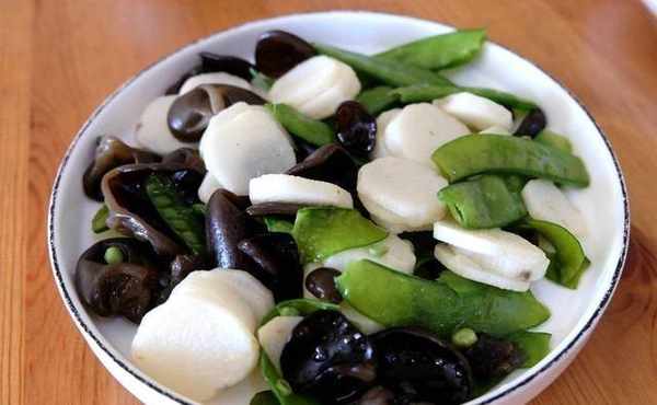 詳細做法:1、山藥去皮切成薄片,想要山藥切的時候不變色,隻要處理山藥的時候用流動的水沖洗著就可以瞭;黑木耳泡發後放到開水鍋裡焯熟備用;荷蘭頭去兩頭,一起去掉豆筋,清洗幹凈備用;