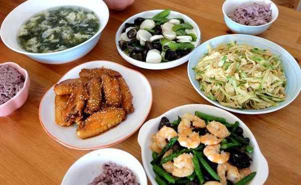今天中午我做瞭四道菜,分別是孩子們愛吃的紅燒雞翅,營養健康的蘆筍木耳炒蝦仁,簡單快手的黑木耳山藥炒荷蘭豆,清爽開胃的黃瓜豆皮拌杏鮑菇,湯是很簡單的紫菜蛋花湯,米飯是大米混合瞭一小把黑米做成的二米飯。每一道都是傢人愛吃的,連孩子都說,最喜歡我們一傢人在一起吃飯的樣子,特別開心。