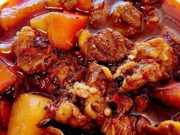 6、冷卻後可以放入土豆和胡蘿卜煮開。如若沒有高壓鍋,可放入普通的燉鍋內,用小火慢慢煮至汁稠、肉酥香即可。