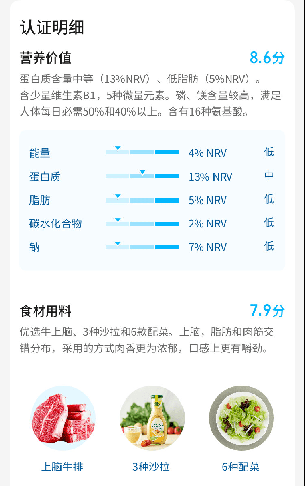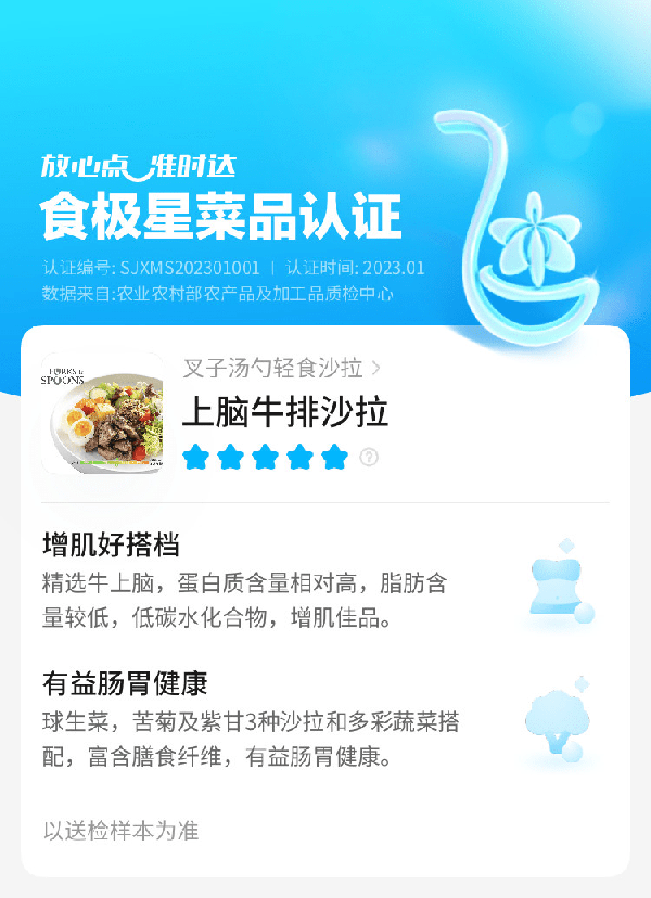 像食極星認證的上腦牛排沙拉,“增肌好搭檔”的標簽一下就能抓住健身人群的目光,詳細的營養成分表則能讓消費者輕松判斷是否選擇這款產品,降低選擇成本,同時還能結合檢驗報告中的詳細數據,較準確地計算每餐的熱量、營養成分攝入。