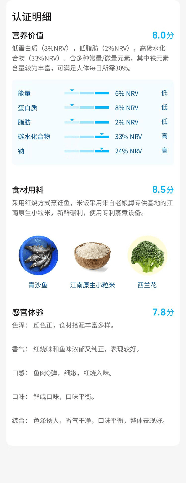 比如某品牌的紅燒魚套餐,消費者點擊食極星的特殊標識後,會顯示該菜品有利於健康用腦、補血養氣,以及菜品在食極星標準體系中三大維度的評分,還會詳細標註能量、蛋白質、脂肪、碳水、鈉等主要營養成分的含量,並告訴消費者該菜品鐵元素豐富,能提供人體每日所需的30%的鐵元素,因此在營養價值上獲得瞭8分的較高評分。