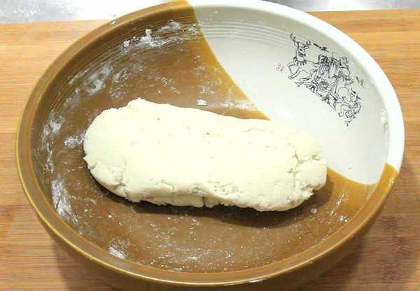 3.盆中加入2勺面粉、3克酵母抓拌均勻,先攪成面絮再和成面團,蓋在盆中,在溫暖的地方發酵2個小時。