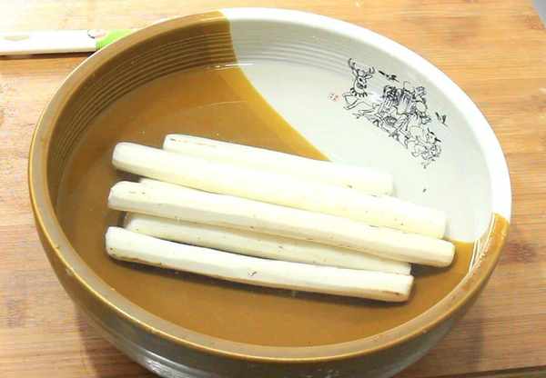 1.準備一個大點的盆子,加入適量的清水和少許白醋,山藥兩根切成段,削凈外皮以後放入盆中浸泡,與空氣隔離,白醋能防止山藥氧化變黑。