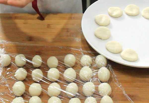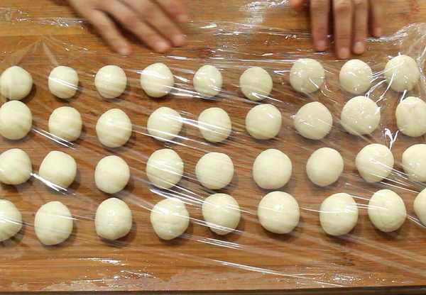 4.2個小時以後面團內部呈現蜂窩狀,在案板上刷一層植物油,防止面團粘在案板上,把發酵好的面團拉成長條,揪下一小塊面團成圓球,剩餘的面團都團成均勻的圓球,全部團好後蓋上一層保鮮膜,進行二次發酵和松弛。