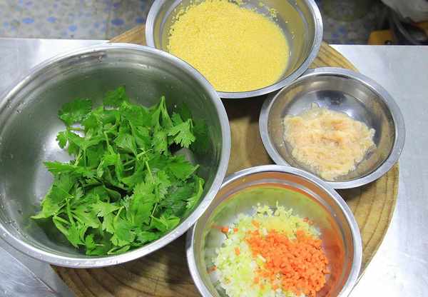 1.準備適量的新鮮芹菜,摘下一點嫩的芹菜葉放在盆中清洗幹凈。一點小米,提前用清水浸泡,多泡一會兒更容易煮熟。再切一點薑末、蔥花、胡蘿卜粒、雞肉絲備用。