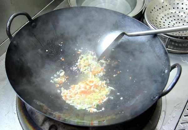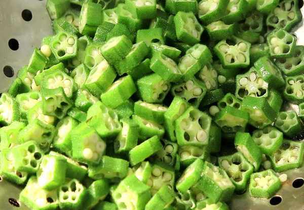 2.鍋內燒油,油溫六成熱,油面冒青煙的時候,倒入切好的秋葵,快速滑油5秒鐘倒出控油,滑油能使秋葵的口感更加的脆嫩,還能防止秋葵粘液溢出。