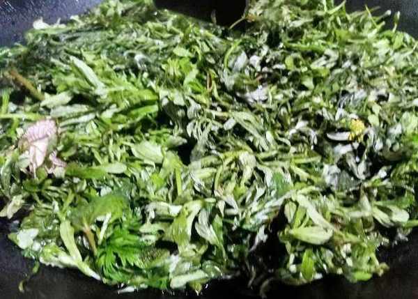 2、接著把清明草倒入鍋內,加入適量清水,水沒過清明草後,大火煮,放入少許小蘇打,撈出後過一下涼水,這是青團保持綠色的重要步驟,這步不能少
