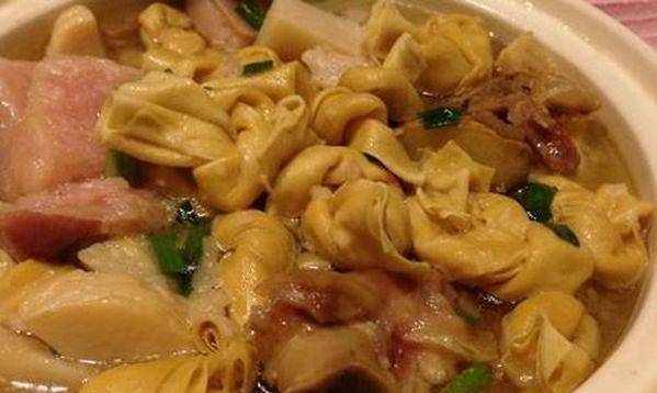 2、再取一燉鍋,下入火腿片、咸肉和豬肉,加入熱水至9分滿,加入2至3大勺花雕酒,燒開後轉小火,燜1小時30分鐘。