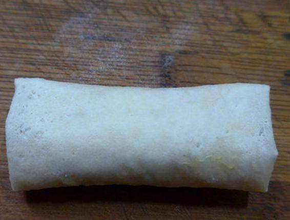 第五步,將兩邊折疊起來,然後順著卷起,壓得稍微緊實一些,用這種辦法依次做好其他的春卷