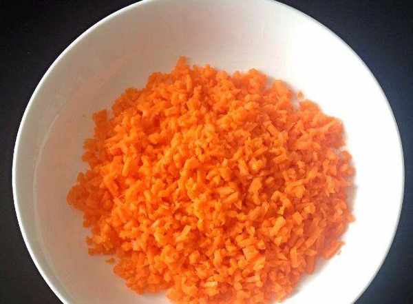 制作過程:第一步,將胡蘿卜清洗去皮之後,用擦絲板才成絲,切碎,盛在碗中