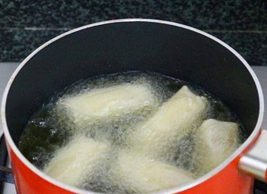 第六步,在鍋中加上440毫升的食用油,燒熱後,將包好的春卷放在油鍋裡面,用中小火炸制金黃色