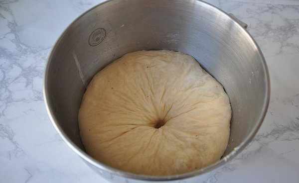 4將揉好的面團放入盆中,蓋保鮮膜後進行第一次發酵,發酵至2倍大。我因為出瞭趟門,所以回傢發現發得有點過頭瞭。