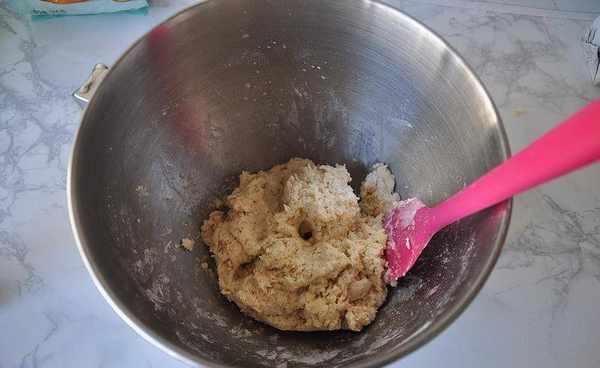 2可以借助矽膠鏟先翻拌一下,讓其沒有幹粉,這時基本就可以觀察出面團的狀態來瞭。
