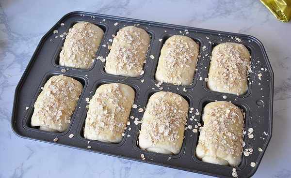 8收緊收口。塑形完成瞭。將面包放在烤盤中,開始二次發酵。我設置瞭50分鐘,面包上面刷蛋液和燕片。