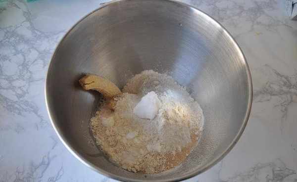 1將香蕉去皮後放入盆中,然後加入面包粉,糖、酵母、牛奶、鹽。牛奶不要一次性加入,要留出10-20,根據情況來增減。