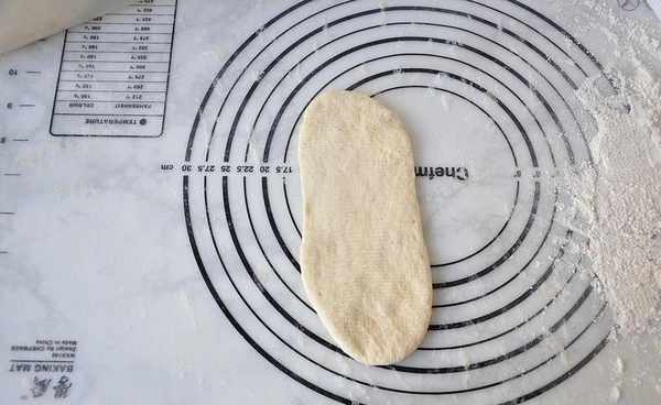 6在案板上撒點粉,將後將面團再搟成長條,再搟開成長橢圓形。這樣塑形好的面團不會超過模具的長度