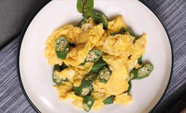秋葵洗凈,切成片狀,雞蛋打散在碗裡,腰果放入烤箱,烤到酥脆後出鍋。鍋內倒油,將蛋液倒入,炒到凝固後盛出來。重新起油鍋,下入秋葵翻炒,炒到變色後,來一點點清水,再倒入雞蛋,用鹽調味,翻炒均勻後,撒上腰果,出鍋。