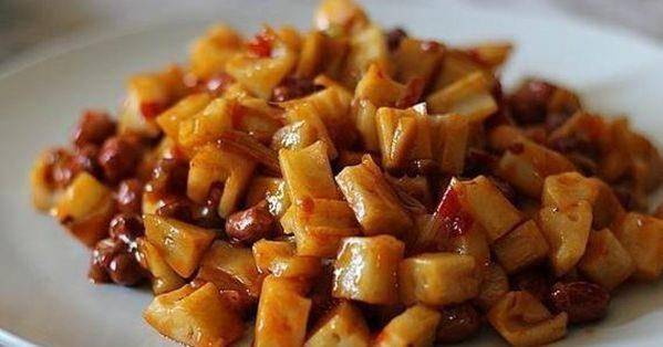 4.放入焯過水的藕丁,翻炒1分鐘後,放入生抽、老抽、糖、鹽調味後,可以適當加入少量清水,讓調味料充分融合,大火收汁後即可出鍋
