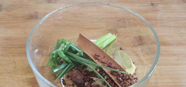 步驟二:準備些配料,生薑切片,蔥打結,桂皮香葉幾個,八角三個、草果一個、花椒一小把,準備好之後即可制作。