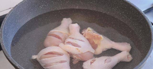 步驟一:首先將雞腿清凈,可以在兩面劃兩刀,這樣更容易入味。往鍋裡倒適量清水,雞腿下鍋,往其中放入一點料酒,方便去腥。撈出來後可以用清水在洗,隨後控幹。