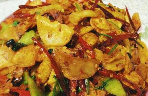 4、倒入炸好的土豆片,放入調味料煸炒至香時即可出鍋