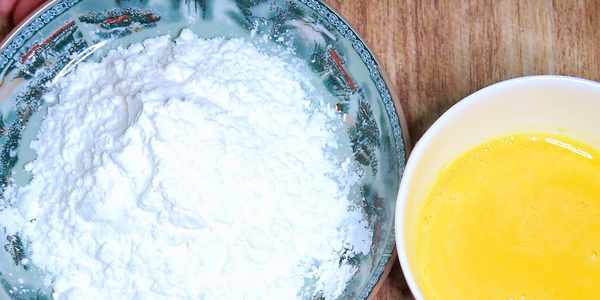 接著往空碗裡敲入兩個雞蛋,用筷子把雞蛋打散,打到蛋白與蛋黃徹底融合,用筷子挑不起蛋白的程度即可。這裡的蛋液一定要打散,不然做出來的菜不好看。然後準備一些玉米淀粉,這裡一定要用玉米淀粉,做出來才會酥脆。