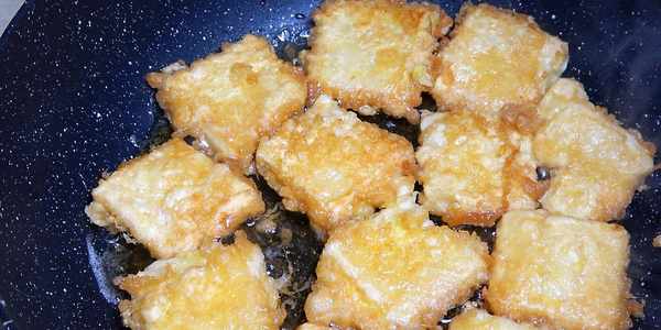 取一塊豆腐,先裹上一層淀粉,再裹上一層蛋液,放入鍋裡用中小火慢煎。為瞭提升速度,大傢可以先把豆腐全部裹上玉米淀粉,下鍋之前再一個個裹蛋液,這樣就會比較快。底部煎到金黃之後給它翻一面,全程用中小火煎,把外面的殼給它煎香煎脆。