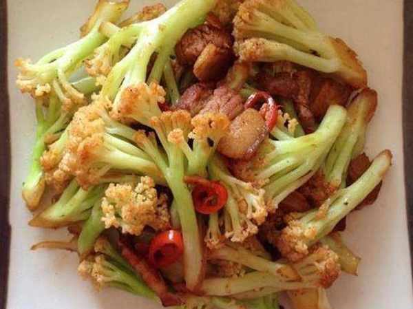 3.五花肉撈出來,倒入花菜之後翻炒下蓋上鍋蓋,開中火,隔30秒左右翻一次;花菜炒的稍微7時尚;油鍋爆香薑蒜辣椒;倒入花菜繼續翻炒,加小勺豆瓣醬,鹽,生抽;繼續炒幹一點後出鍋