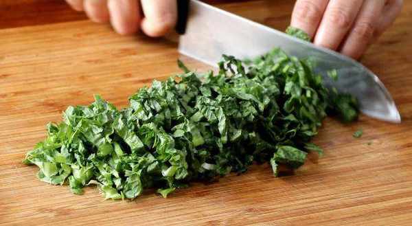 1、 油麥菜摘好葉子,清洗幹凈,切成小段。