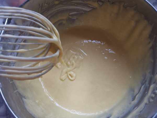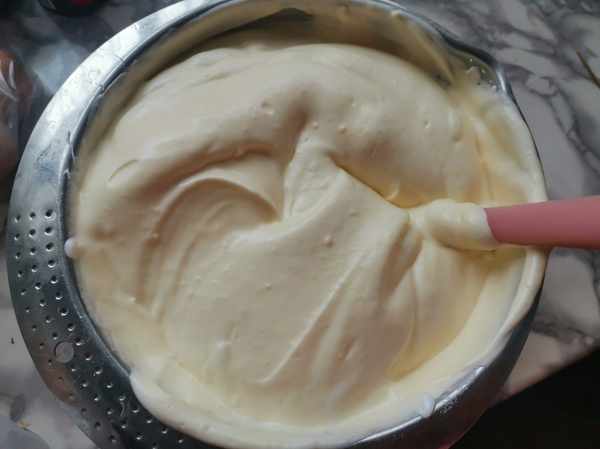 第四步:把蛋白霜分次翻拌到蛋白霜中,就成了細膩的蛋糕糊。