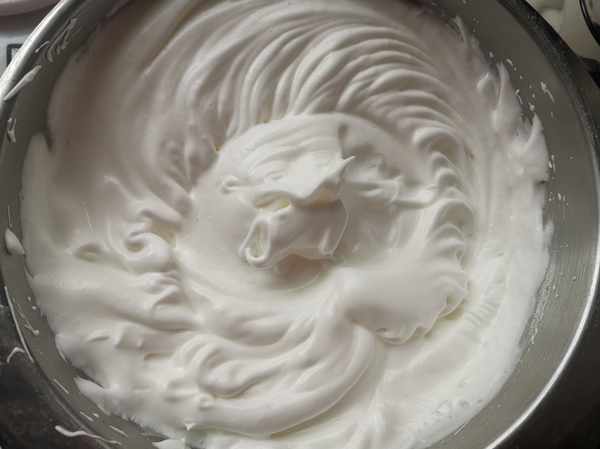 第三步:把蛋清加入白糖,用電動打蛋器攪打成幹性發泡的蛋白霜,提起打蛋器,打蛋器頭上呈直角,即可。或者插入筷子不倒就是好了。