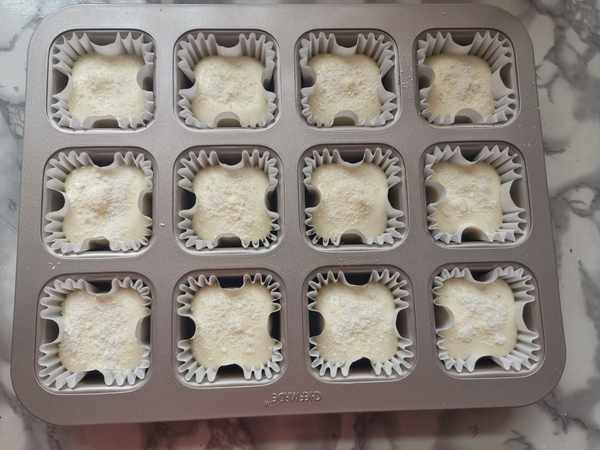 第五步:烤盤裏放入紙杯,把蛋糕糊舀入紙杯,撒上椰蓉。