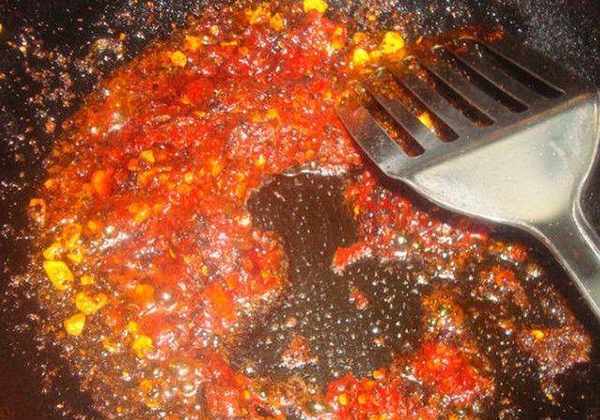 第三步,在炒鍋中倒上油,加上豆瓣醬翻炒至出紅油,加上蔥薑蒜炒香