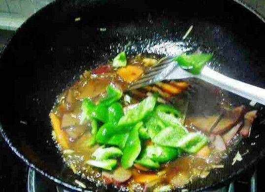 第七步,等炒鍋燒開後,勾入薄芡,再放入切好的青椒,翻炒均勻後,便可以出鍋裝盤,然後便美美的享用