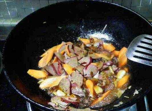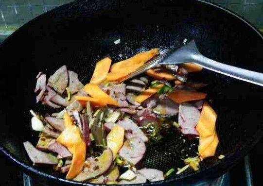 第四步,然後放入切好的豬肝,翻炒均勻後,倒上胡蘿卜片繼續翻炒